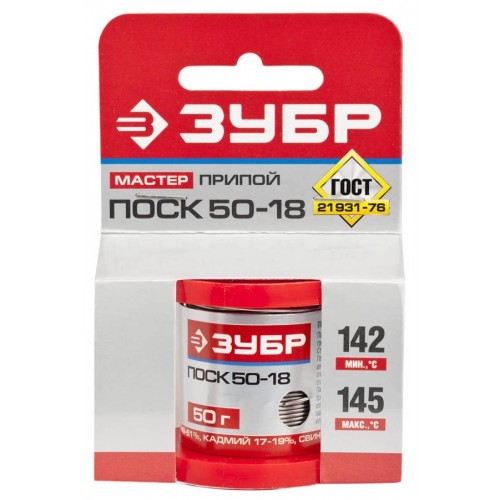 Припой оловянно-свинцовый с кадмием ПОСК 50-18 ЗУБР, арт.55454-050-10,серия ″Мастер″, применяется для пайки деталей, чувствительных к перегреву – металлизированной керамики, полупроводниковой техники, медных и медно-никелевых сплавов с посеребренной керамикой, посеребренных деталей, ювелирных изделий, ступенчатой пайки конденсаторов.