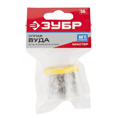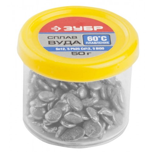 Сплав ЗУБР 55458-050, применяется для предварительной припайки контактов, пайки микрофонов и термочувствительных элементов, лужения печатных плат. Содержит около 12.5% олова, 25% свинца, 12.5% кадмия, 50% висмута. Соответствует ГОСТ 21931-76. Предназначен для профессионального использования. Высший уровень качества. Прошел спектральную и химическую проверку.