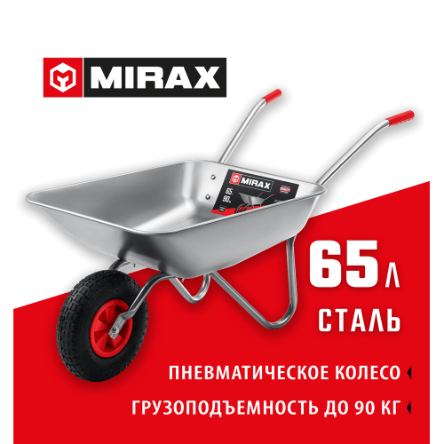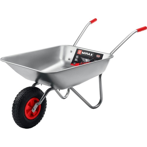 Тачка MIRAX 39900, применяется для транспортировки различных грузов во время проведения строительных работ. Стальной кузов толщиной 0,7 мм и объемом 65 л для сыпучих грузов имеет цинковое покрытие, обеспечивающее защиту тачки от внешних воздействий.
