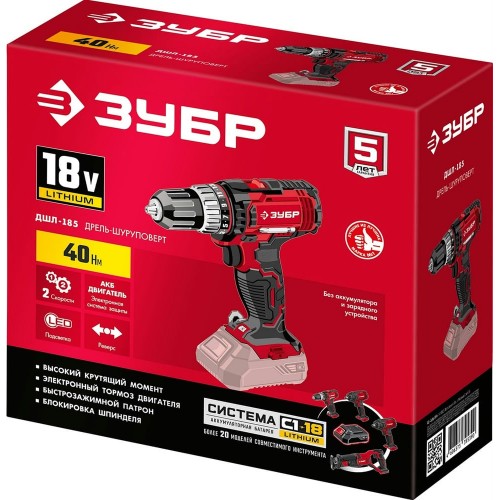 Аккумуляторная дрель шуруповерт ЗУБР ДШУ-185, предназначена для сверления отверстий в различных материалах (при установке сверла), а также для вкручивания/выкручивания шурупов, саморезов и винтов (при установке соответствующих бит). Инструмент увеличенной мощности с отличной эргономикой. Компактная аккумуляторная дрель- шуруповерт с удобной эргономикой для комфортной работы. Высокий крутящий момент при широком диапазоне оборотов благодаря конструкции редуктора. Возможность сверления плотных материалов специальной оснасткой таких как бетон, кирпич и камень. Бесключевой одномуфтовый патрон для максимальной простоты и скорости замены расходного инструмента. Двухскоростной планетарный редуктор позволяет как заворачивать с большим крутящим моментом, так и сверлить на высоких оборотах. Широкий диапазон регулировки крутящего момента превращает изделие в универсальный инструмент: от аккуратного закручивания маленьких винтиков до заворачивания крупных саморезов.