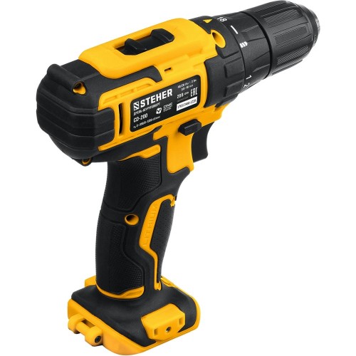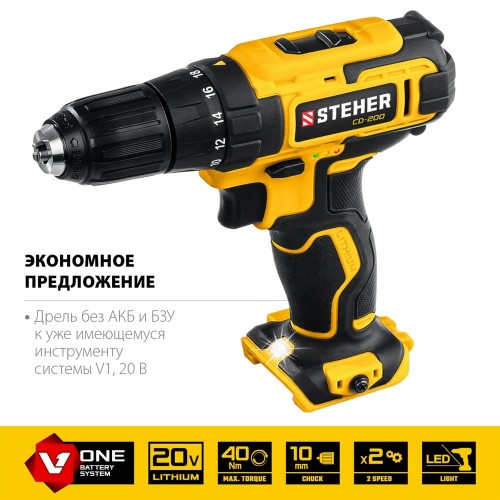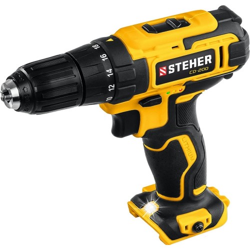 Аккумуляторная дрель шуруповерт STEHER CD-200, предназначена для сверления отверстий в различных материалах (при установке сверла), а также для вкручивания/выкручивания шурупов, саморезов и винтов (при установке соответствующих бит). -Компактный, мощный аккумуляторный шуруповерт в линейке единой аккумуляторной платформы 20 В. Изделие без батареи и ЗУ в комплекте экономит до 60% средств при покупке (при владении другими инструментами Steher системы Li-Ion V1 20 В). Высокий крутящий момент при широком диапазоне оборотов благодаря конструкции редуктора. Бесключевой одномуфтовый патрон для максимальной простоты и скорости замены расходного инструмента. Двухскоростной планетарный редуктор позволяет как заворачивать с большим крутящим моментом, так и сверлить на высоких оборотах. Широкий диапазон регулировки крутящего момента превращает изделие в универсальный инструмент: от аккуратного закручивания маленьких винтиков до заворачивания крупных саморезов. Возможность быстрой смены биты благодаря блокировке шпинделя.