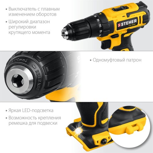 Новый недорогой шуруповерт Steher - помощник в сверлении и заворачивании. Индивидуальный дизайн, удобная эргономика, высокие скорость и крутящий момент обеспечивают комфортную и производительную работу. Очень выгодное предложение для имеющих инструменты серии