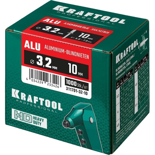 Алюминиевые заклепки KRAFTOOL 311701-32-10, предназначены для получения неразъемного соединения из двух или более слоев материалов с помощью заклепочника.