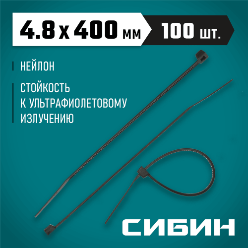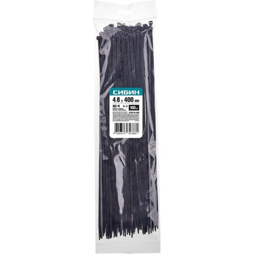 Хомуты нейлоновые черные СИБИН 3788-48-400, предназначены для быстрой стяжки кабелей электропроводки в пучок и их крепления к различным элементам конструкции при проведении электромонтажных работ.