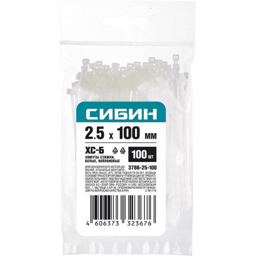 Хомуты нейлоновые белые СИБИН 3786-25-100, предназначены для быстрой стяжки кабелей электропроводки в пучок и их крепления к различным элементам конструкции при проведении электромонтажных работ.