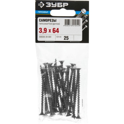 Саморезы гипсокартон-дерево ЗУБР 300036-39-064, предназначены для крепления гипсокартона к деревянной обрешетке, не допуская крошение волокнистой структуры дерева. Саморезы легко вкручиваются обычным шуруповертом или отверткой с крестообразным шлицем PH2 (DIN). Предварительное сверление в скрепляемых материалах не требуется. Фосфатированное покрытие обеспечивает защиту от коррозии. Широко применяются при выполнении бытового ремонта, сборке и установке различных конструкций. Саморезы для гипсокартона изготовлены из стального прутка с высоким содержанием углерода. Контроль геометрией самореза начинается с калибровки прутка и заканчивается тщательной проверкой размеров готового изделия. Нормативная твердость стали достигается термической обработкой. Поверхностная твердость 450-720HV, твердость в сердцевине 290-450HV.