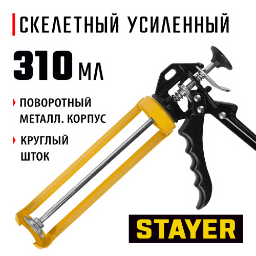Пистолет для герметиков подходит для работы с картриджами объемом 310 мл, имеет усиленную скелетную конструкцию из стали, ручку из алюминиевого сплава, которые способствуют равномерной подачи клея либо герметика. Данная спецификация обеспечивает прочность и надежность конструкции пистолета при использовании.