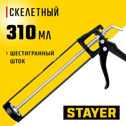 Пистолет для герметика STAYER 0665, предназначен выдавливания и нанесения герметиков, а также клеевых составов из картриджей объемом до 310 мл. Имеет скелетную конструкцию, оснащен шестигранным усиленным штоком, так же использующиеся более прочная рукоятка и головная части пистолета позволяют работать с материалами повышенной вязкости.