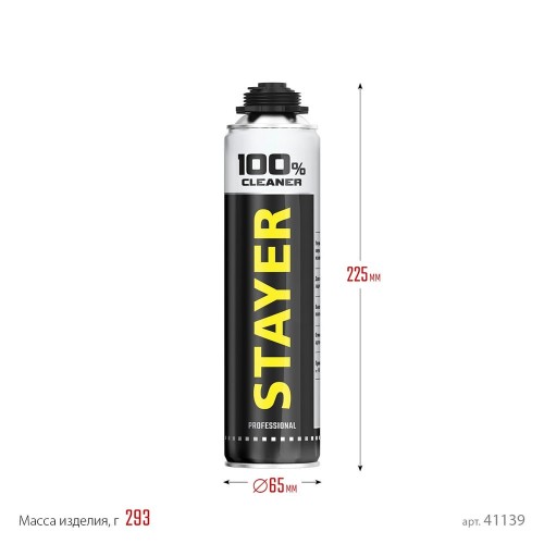 Очиститель монтажной пены STAYER 41139, предназначен для устранения загрязнений полиуретановой монтажной пены с рабочих поверхностей, кожных покровов. Незаменим при очистке монтажного пистолета от пены.