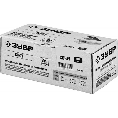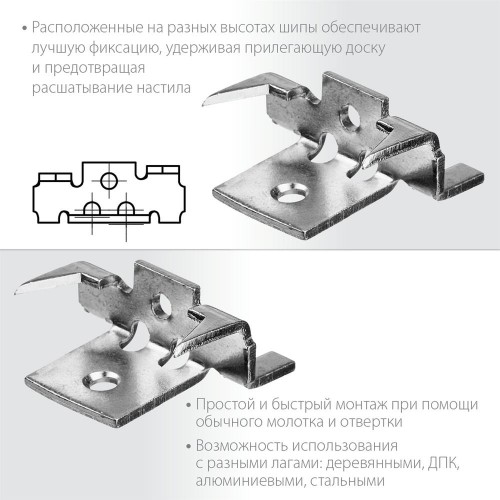 Крепеж с шипами и дистанциром для террасной доски Союз ЗУБР 30701, предназначен для существенного ускорения и облегчения проведения отделочных работ, обладая при этом рядом преимуществ по сравнению с традиционным креплением при помощи гвоздей. Доска крепится к обрешетке двумя саморезами под углом 90 через монтажные отверстия на плоскостях крепежа. Если доступ к крепежу затруднен, монтаж осуществляется одним или двумя саморезами в основание под углом 45. Подбирайте длину саморезов исходя из толщины монтируемой доски и бруса обрешетки.