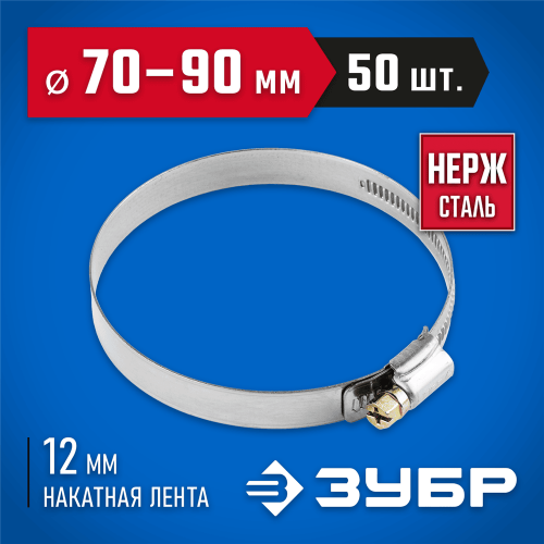 ЗУБР 50 шт., 70-90 мм, нерж. сталь, накатная лента 12 мм, хомуты 37822-70-90-50 Профессионал