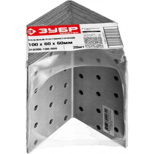 Углы равносторонние ЗУБР 310206-100-060, предназначены для крепления несущих и дополнительных элементов из дерева, на которые действует большая нагрузка - бруса, балок перекрытия, стоек. Углы крепятся к деревянному основанию специальными гвоздями с конической головкой или саморезами. Наличие большого количества отверстий позволяет легко и быстро осуществить крепление в заданном месте. Использование крепежных углов позволяет избежать трудоемких операций по созданию различных пазов, выступов, шпонок и прорезей в процессе сборки деревянных конструкций при строительстве домов, устройстве крыш, креплении деревянных конструкций к фундаменту и т.п. Изготовлен из высококачественной листовой стали. Цинковое покрытие надежно защищает от коррозии.