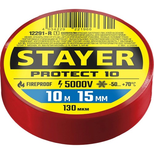 • STAYER 10м х 15 мм, красная, Protect-10 изолента ПВХ 12291-R_z01 Professional