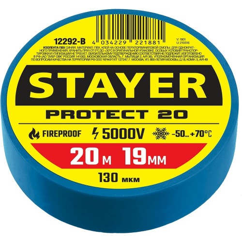 STAYER 19 мм, 20 м, цвет синий, изолента ПВХ не поддерживает горение Protect-20 12292-B