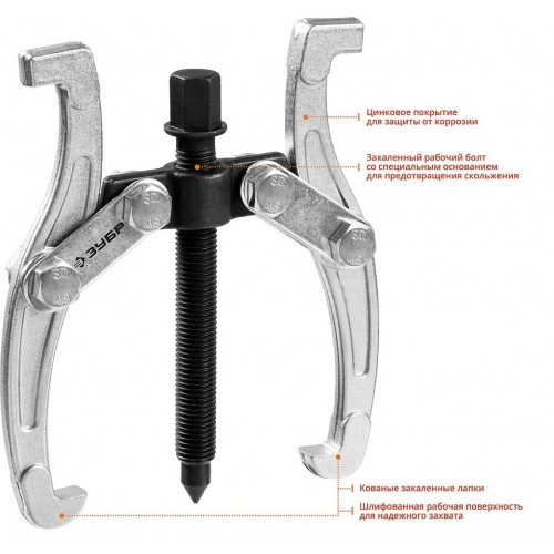 Захваты съемника выкованы из качественной инструментальной стали, что обеспечивает долгий срок службы при работе с высокими нагрузками. Позволяет работать с широким рядом узлов