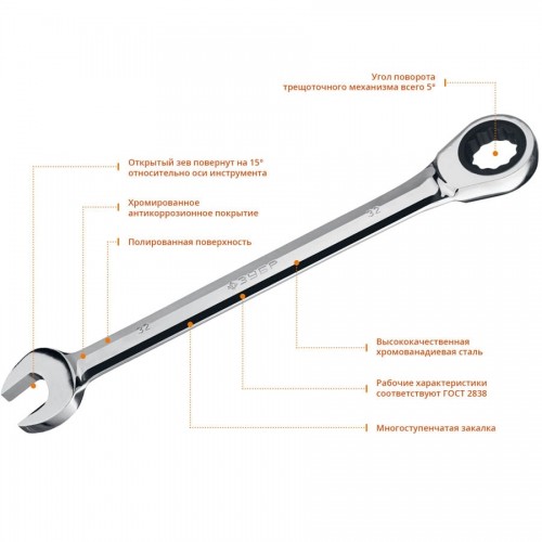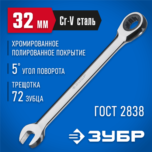 ЗУБР 32 мм, комбинированный гаечный ключ трещоточный 27074-32
