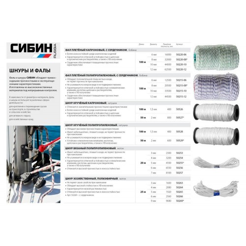 Фал СИБИН 50215-10, плетёный полипропиленовый с сердечником, предназначен для хозяйственно-бытового применения. Обладает положительной плавучестью в воде, не теряют прочности при намокании. Не усаживаются в мокром виде и не подвержены гниению. Характеризуются отличной устойчивостью к климатическим влияниям, кислотам, щелочам и растворителям, хорошей устойчивостью к УФ-излучению
