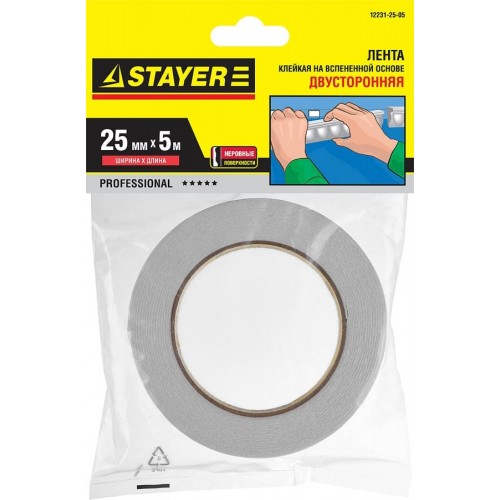 STAYER 25 мм х 5 м, белая, на вспененной основе, двусторонняя клейкая лента (скотч) 12231-25-05