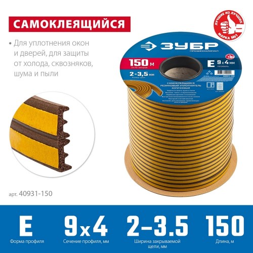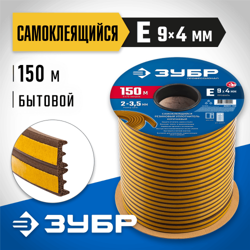 ЗУБР E-профиль, размер 9 х 4мм, коричневый, 150м, самоклеящийся резиновый уплотнитель (40931-150)