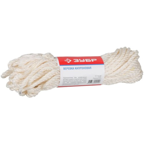 Капроновая веревка ЗУБР 50206, предназначена для хозяйственно-бытовых целей и упаковочных работ. Хорошо вяжется в узлы и не пачкает груз при соприкосновении.