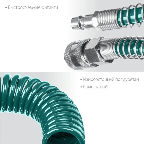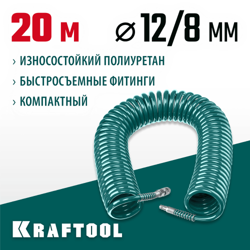 Воздушный шланг с фитингами KRAFTOOL 06590-20 предназначен для подключения инструмента к пневмосистеме. Износостойкий полиуретан. Быстросъемные фитинги. Компактный.