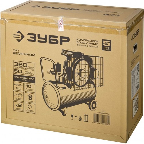 ЗУБР 2200 Вт, 360 л/мин, 50 л, ременной, масляный, компрессор электрический ЗКПМ-360-50-Р-2.2