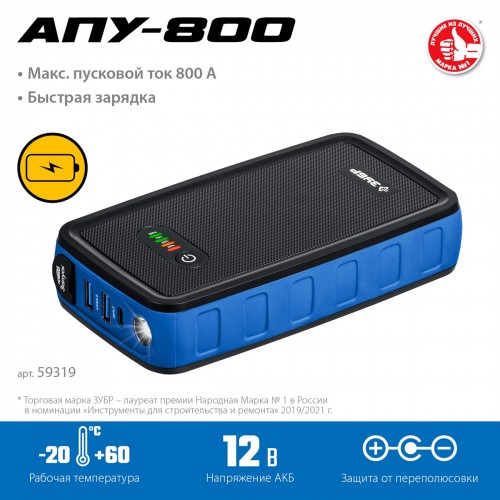 Пусковое устройство ЗУБР 59319, предназначено для аварийного запуска двигателя транспортного средства в случае неисправной АКБ. Устройство подходит для любых типов транспортных средств с напряжением бортовой сети 12В, а также служит для подзарядки и работы широкого ряда мобильной техники и электроники от встроенных разъемов USB 5В. Мощности устройства хватает на запуск двигателя объемом 5 литров (бензиновый) или 3 литра (дизельный). Широкий рабочий температурный режим: -20˚C + 60˚C. Возможность зарядки мобильной электроники. Компактный размер.
