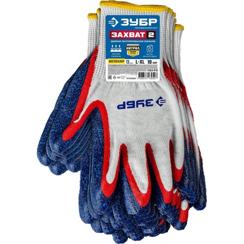 ЗУБР L-XL, 10 пар., перчатки с двойным текстурированным нитриловым обливом ЗАХВАТ-2 11454-K10 Профессионал