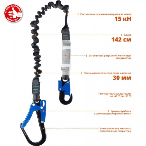 Строп одноплечный ЗУБР 11595, применяется как средство защиты от падения с высоты. Крюки-карабины с самозакрывающимся замком. Встроенный разрывной ленточный амортизатор. Металлические элементы с полимерным покрытием повышают срок эксплуатации. Температура эксплуатации от -40 до +50 градусов. Соответствует ГОСТ Р ЕН 354, ГОСТ Р ЕН 355, ТР ТС 019/2011.