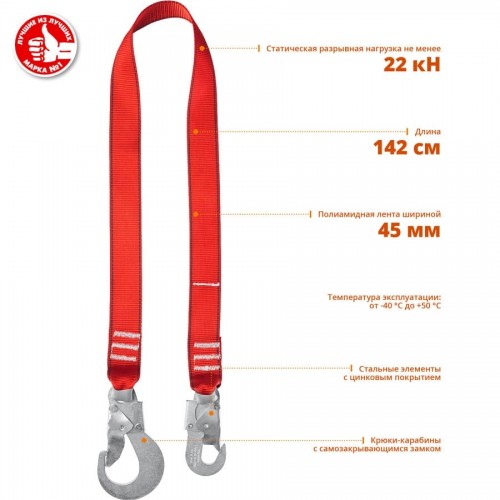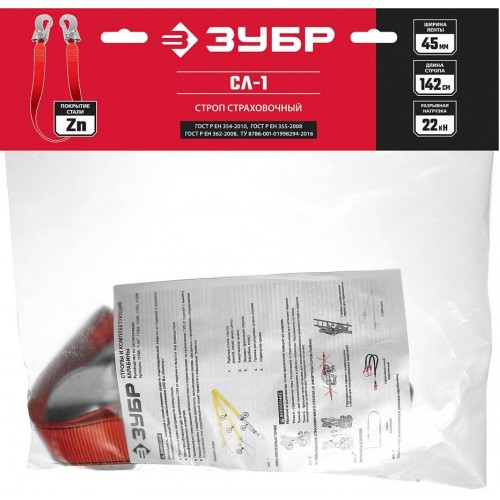 Строп одноплечный ЗУБР 11589, применяется как средство защиты от падения с высоты. Имеются крюки-карабины с самозакрывающимся замком. Статическая разрывная нагрузка не менее 22кН. Длина – 142 см. Температура эксплуатации от -400 до +500