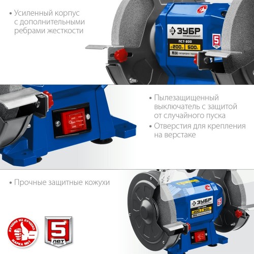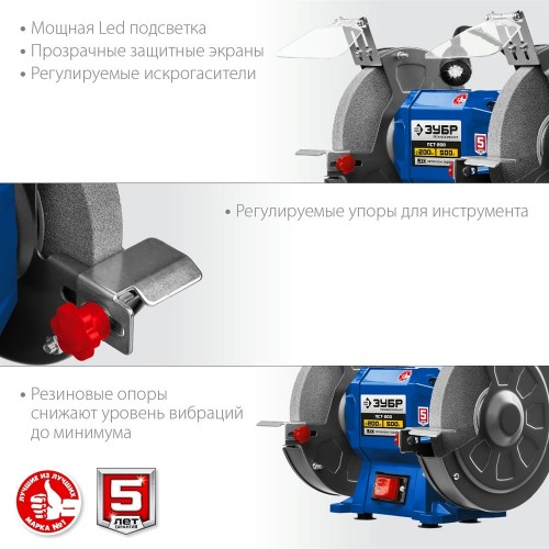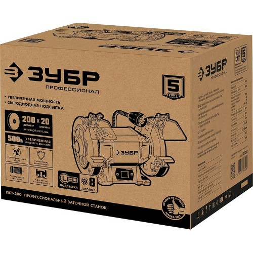 Станок точильный ЗУБР ПСТ-200, предназначен для заточки и шлифовки металлических заготовок и режущего инструмента. Двигатель большой мощности способен выполнить даже самую тяжелую работу. Два круга разной зернистости для любых работ. Асинхронный двигатель, не требующий обслуживания весь срок службы. LED подсветка рабочей зоны. Прозрачные экраны для защиты оператора от продуктов обработки. Пылезащищенный выключатель для беспроблемной эксплуатации. Возможность крепления к опорной поверхности. Регулируемый упор для инструмента.