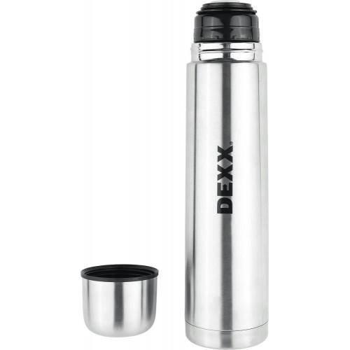 Термос DEXX 48000-1000, предназначен для сохранения температуры находящихся внутри жидкостей. Пробка-клапан с резьбовым соединением препятствует потере тепла. Термос оснащен крышкой-чашкой.