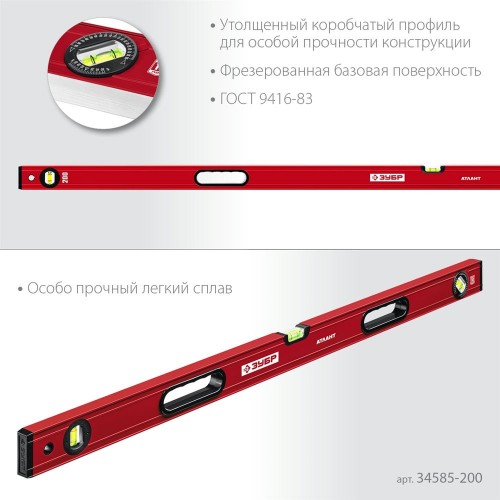 Уровень строительный ЗУБР 34585-200_z01, предназначен для контроля горизонтальности и вертикальности поверхностей. Усиленный профиль для повышения прочности конструкции. 3 ударопрочные колбы. Рукоятки повышают удобство измерений.