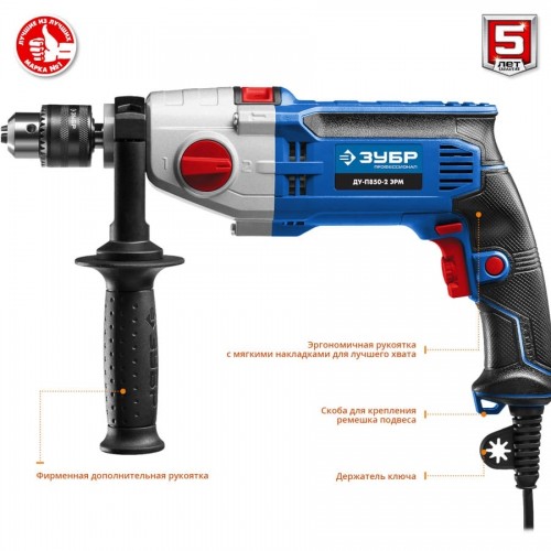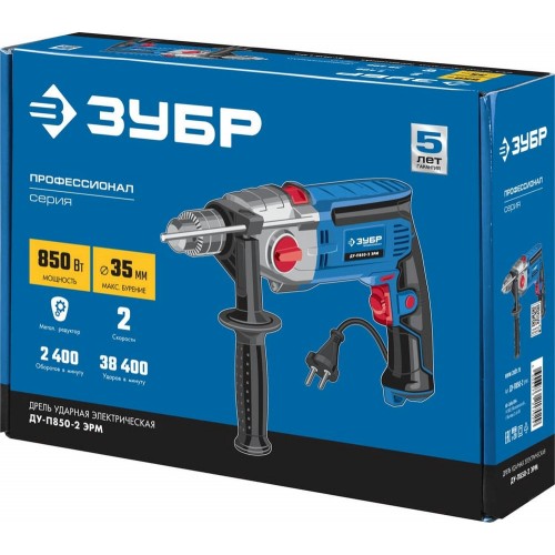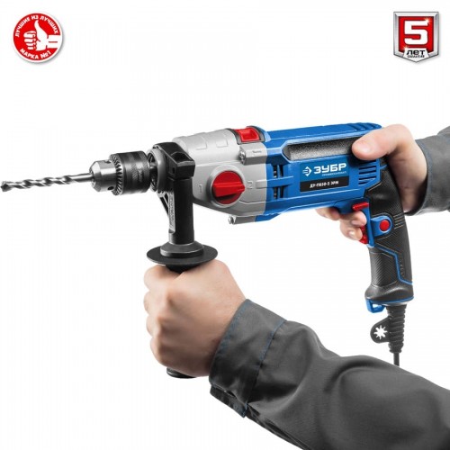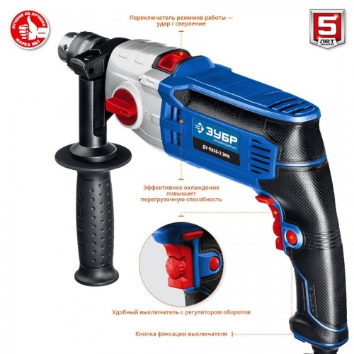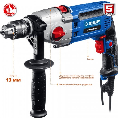 Дрель ударная электрическая ЗУБР ДУ-П850-2 ЭРМ, предназначена для сверления отверстий в различных материалах (дерево, сталь, кирпич, легкий бетон и т. д.) при установке соответствующих сверл, монтаж резьбовых соединений (при установке соответствующих бит), перемешивание ЛКМ (при установке соответствующей насадки). Корпус редуктора из литого под давлением алюминия обладает повышенной прочностью. Благодаря двухскоростному редуктору с широким диапазоном скоростей изделие может выполнять большой спектр задач: сверление, заворачивание, перемешивание, шлифование и т.д. Функция сверления с ударом позволяет выполнять отверстия в кирпиче и легком бетоне. Ударные шестерни из хромового сплава продлевают срок жизни ударного механизма. Надежное удержание дрели благодаря обрезиненной основной и удобной дополнительной рукояткам. Фиксация выключателя во включенном положении для удобства при длительных работах. Ограничитель глубины сверления позволяет бурить точно на заданную глубину при серийной работе.