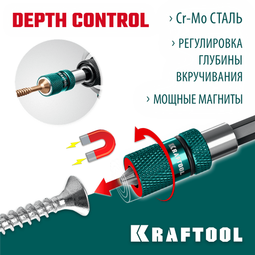 Адаптер для бит KRAFTOOL 26764, предназначен для монтажа и демонтажа резьбовых соединений совместно с механизированным инструментом. Профессиональный адаптер с регулировкой глубины вкручивания крепежа KRAFTOOL Depth Control разработан в соответствии с высокими требованиями, обеспечивают высокую надежность. Настраиваемый ограничитель позволяет отрегулировать глубину вкручивания. Корпус из нержавеющей стали не примагничивает стружку и не блокирует мощное направленное действие двух магнитов. Хвостовик из высококачественной Cr-Mo стали. Магнитное кольцо для удержания крепежа. Мощный редкоземельный неодимовый магнит для удержания биты.