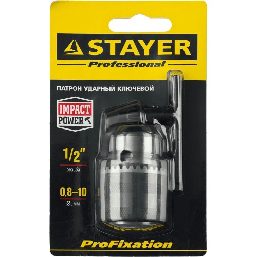 Патрон ударный STAYER "PROFESSIONAL" ключевой для дрели, 10 мм, с ключом в комплекте, посадочная резьба 1/2", Д 0,8-10мм (29055-10-1/2)