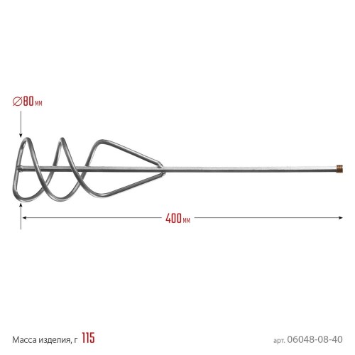 Насадка для строительного миксера СИБИН 06048-08-40, предназначена для равномерного распределения смешиваемых материалов. Спиралевидная структура рабочей части обеспечивает эффективное перемешивание с направлением потока смеси вверх. Используемая сталь с уникальным покрытием защитит насадку для миксера от внешних воздействий.