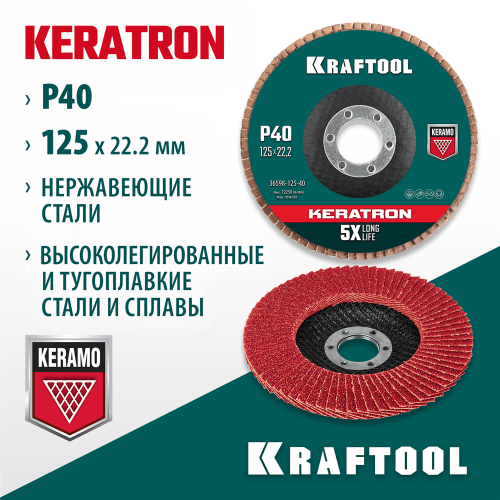 KRAFTOOL d=125x22.2 мм, P 40, круг лепестковый торцевой по нержавеющей стали KERATRON 36598-125-40