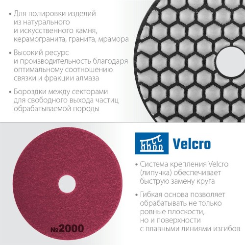Алмазный гибкий шлифовальный круг (Черепашка) для сухого шлифования ЗУБР 29868-2000, предназначен для сухой шлифовки и полировки изделий из натурального и искуственного камня, керамогранита, гранита, мрамора. Используется на ручном электроинструменте (УШМ, полировальные машины, дрели) с насадкой адаптером под липучку Velcro. Охлаждение водой повышает ресурс инструмента. Высокий ресурс и производительность благодаря оптимальному соотношению связки и фракции алмаза. Гибкая основа позволяет обрабатывать не только ровные плоскости, но и поверхности с плавными линиями изгибов. Система крепления Velcro (липучка) обеспечивает быструю замену круга. Широкая сфера применения: обработка каменных столешниц, подоконников, ступеней, скульптур, декоративной плитки, снятие фасок, заусовка, полировка сколов, различные реставрационные работы.