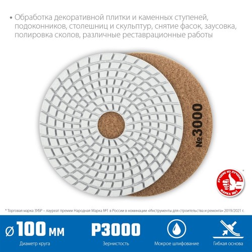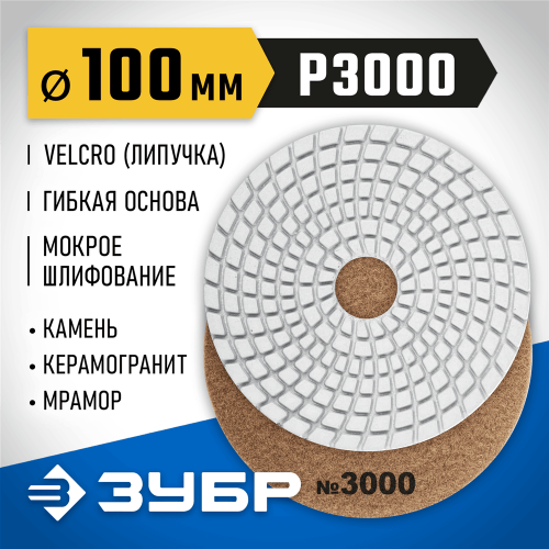 Алмазный гибкий шлифовальный круг (Черепашка) ЗУБР 29866-3000 предназначен для предназначен для шлифовки и полировки изделий из натурального и искуственного камня, керамогранита, гранита, мрамора с применением водяного охлаждения. Используется на ручном электроинструменте (УШМ, полировальные машины, дрели) с насадкой адаптером под липучку Velcro. Высокий ресурс и производительность благодаря оптимальному соотношению связки и фракции алмаза. Гибкая основа позволяет обрабатывать не только ровные плоскости, но и поверхности с плавными линиями изгибов. Система крепления Velcro (липучка) обеспечивает быструю замену круга. Широкая сфера применения: обработка каменных столешниц, подоконников, ступеней, скульптур, декоративной плитки, снятие фасок, заусовка, полировка сколов, различные реставрационные работы.