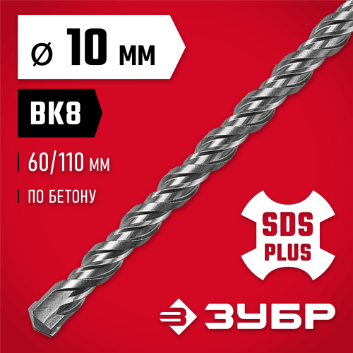 Бур по бетону SDS Plus ЗУБР 29315-110-10, для перфоратора, применяется при сверлении отверстий в бетоне, граните, кирпичной кладке, камне и твердых известняках. Динамичный наконечник бура из твердого сплава ВК8 в форме зубила обеспечивает быстрое вхождение в материал. Спираль 4S с усиленным сердечником обеспечивает оптимальную устойчивость бура к излому.