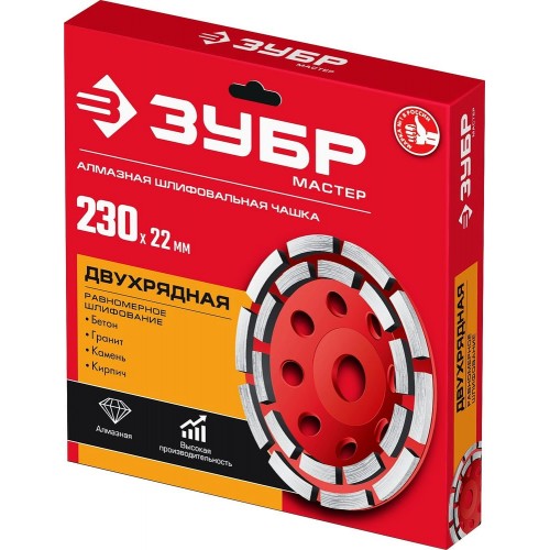 ЗУБР 230 мм, алмазная, двухрядная, сегментная, шлифовальная чашка 33376-230 МАСТЕР