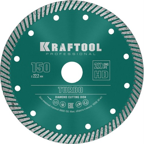 Алмазный диск отрезной KRAFTOOL 36682-150, предназначен для резки армированного бетона, кирпича, тротуарной плитки, черепицы. Технология DHP (Double Hot Pressing) - процесс двойного спекания при высоких температурах обеспечивает максимальную плотность алмазоносного слоя, высокую скорость реза и увеличение срока эксплуатации инструмента. Оптимально подобранные компоненты металлической связки с высотой алмазной кромки в 10 мм гарантируют продолжительный рабочий ресурс диска при работе даже с самыми сложными в обработке материалами. Минимизация бокового трения благодаря сегментированной форме режущей кромки. Эффективная работа без принудительного охлаждения.