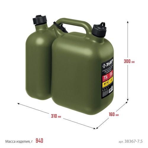 Пластиковая канистра ЗУБР 38367-7.5 предназначена для хранения и транспортировки топлива и технических жидкостей. Устойчива к механическим воздействиям даже при отрицательных температурах (до -30C). В состав пластика входят антистатические добавки. Крышка с маслобензостойким уплотнителем. Гибкий носик для заливки ГСМ. Защита крышки от случайного откручивания. Выемка на дне для удобного хвата при заливке ГСМ. Допускается использование на АЗС. Гибкий носик для удобной заливки жидкости в комплекте.