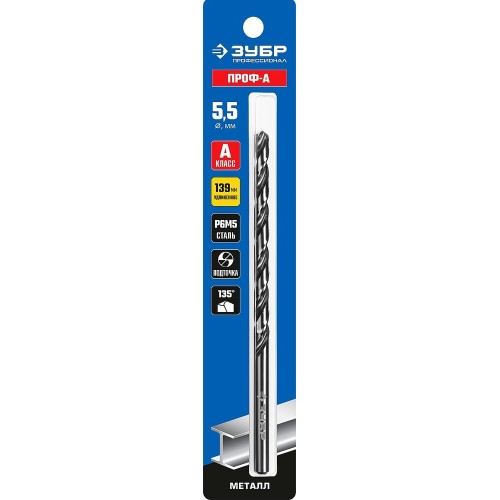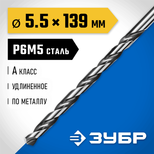 ЗУБР Ø 5.5 x 139 мм, сталь Р6М5, класс А1, сверло удлиненное по металлу 29624-5.5 Профессионал