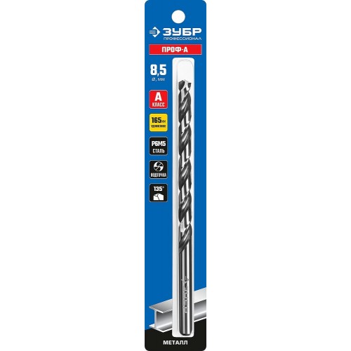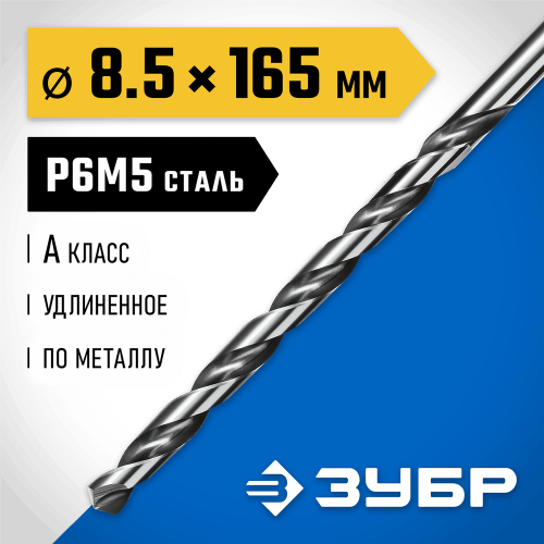 ЗУБР Ø 8.5 x 165 мм, сталь Р6М5, класс А1, сверло удлиненное по металлу 29624-8.5 Профессионал