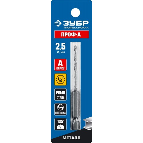 ЗУБР Ø 2.5 x 77 мм, НЕХ 1/4", сталь Р6М5, класс А1, сверло спиральное по металлу 29623-2.5 Профессионал