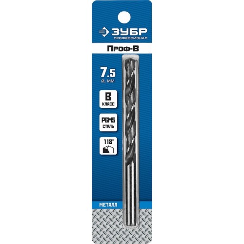 Сверло ЗУБР 29621-7.5, предназначено для обработки легированных и углеродистых сталей с пределом прочности до 900 Н/мм², цветных металлов, серого чугуна и пластмассы. Качественное сверло с высоким ресурсом. Изготовлено методом винтового проката по ГОСТ 10902-77 и соответствует классу точности "В". Угол заточки 118 градусов позволяет обрабатывать легированные и углеродистые стали.