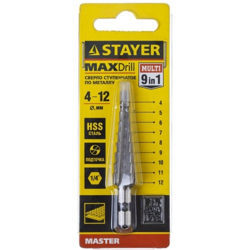 STAYER 4-12 мм, 9 ступеней, HSS, сверло ступенчатое 29660-4-12-9 Master