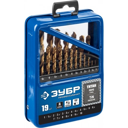 ЗУБР 19 шт. (Ø 1-10 мм), ТИТАН, Р6М5, класс А, набор сверл по металлу 29617-H19_z01 Профессионал